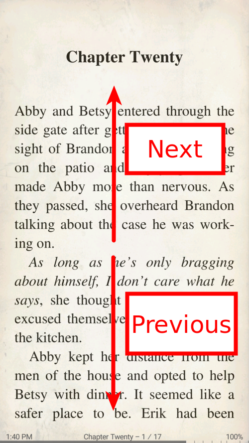 No modo de rolagem, as páginas dos livros são roladas para cima e para baixo com os dedos