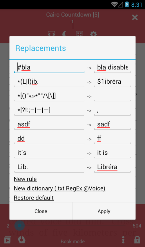 Librera يدعم ملفات قواعد RegExp من Voice Reader راجع هذه العينة demo-replaces.txt أدناه: