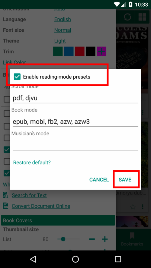 - Sagen Sie Librera, welchen Standardlesemodus Sie für ein bestimmtes Buchformat bevorzugen