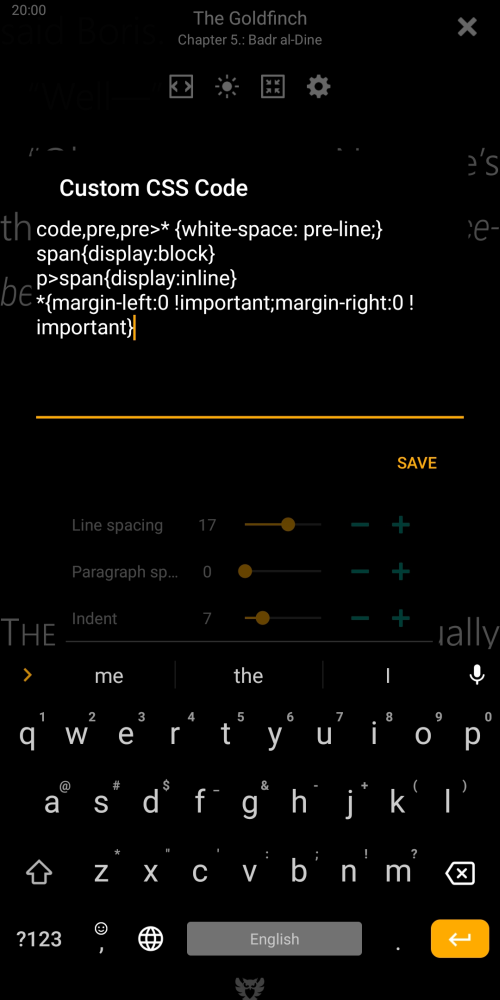 Beim Rendern von Büchern übernimmt Librera normalerweise die Formatvorlagen aus der CSS-Datei des Buches und wendet Ihre Einstellungen auch im Fenster Einstellungen an. Es kann auch das eine oder andere separat nutzen. Aber manchmal ist es nicht genug. Einige Bücher haben so eigenartigen CSS-Code, dass Sie keine andere Wahl haben, als die CSS-Dateien zu bearbeiten, um die Lesbarkeit zu verbessern. Librera bietet Ihnen jedoch eine weitere Option: Fügen Sie vorübergehend benutzerdefinierten CSS-Code hinzu, der nach Abschluss des herausgeforderten Buches einfach entfernt werden kann.