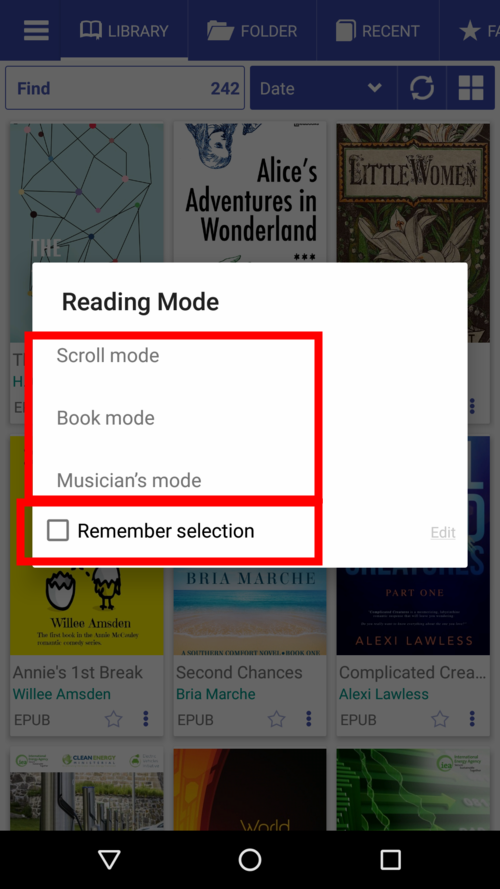 • Check the Remember reading mode box and select your default mode for all books