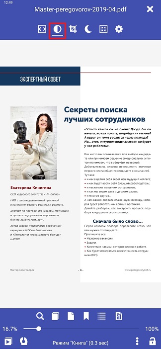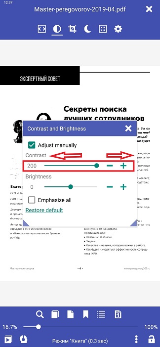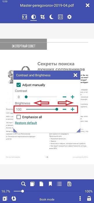 La lisibilité des PDF dans Librera Reader peut être considérablement améliorée par des ajustements manuels des paramètres de luminosité et de contraste. Lorsque vous passez en mode manuel, votre document sera affiché en noir et blanc et vous verrez les résultats de vos ajustements en temps réel en arrière-plan, derrière la fenêtre Contraste et luminosité. Les réglages reproduisent l’effet souvent utilisé dans les lecteurs E-Ink.