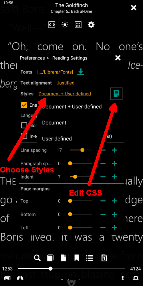 Beim Rendern von Büchern übernimmt Librera normalerweise die Formatvorlagen aus der CSS-Datei des Buches und wendet Ihre Einstellungen auch im Fenster Einstellungen an. Es kann auch das eine oder andere separat nutzen. Aber manchmal ist es nicht genug. Einige Bücher haben so eigenartigen CSS-Code, dass Sie keine andere Wahl haben, als die CSS-Dateien zu bearbeiten, um die Lesbarkeit zu verbessern. Librera bietet Ihnen jedoch eine weitere Option: Fügen Sie vorübergehend benutzerdefinierten CSS-Code hinzu, der nach Abschluss des herausgeforderten Buches einfach entfernt werden kann.