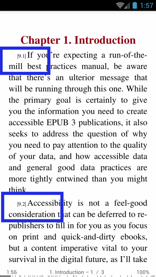 Según un manual en línea de Calibre Viewer, en Modo de referencia se mostrará un número único al comienzo de cada párrafo, en referencia a este párrafo en particular. "Este número es independiente del tamaño de la ventana del visor o del tamaño de la fuente". Los números podrían usarse para mapear el documento, crear una tabla de contenido, marcar, etc.