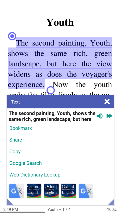 - Der RSVP-Modus kann über das Buchmenü gestartet werden (Schnelllesen).