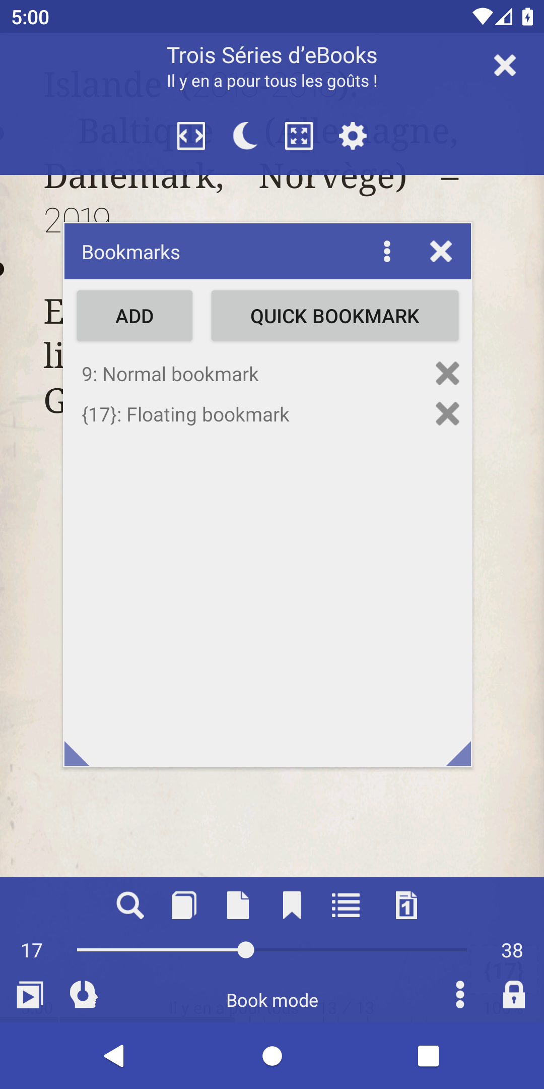Librera supports two types of bookmarks: normal and floating. The user is allowed to change their text and page number