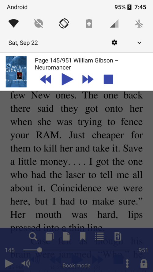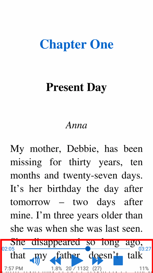 Open an external audio file from the TTS Settings dialog and listen to it while reading. This feature should come in handy for those learning foreign languages or for musicians. Librera player is also a shot at reading multimedia books. The format of the status bar legend can be changed from full to compact to chapter-oriented